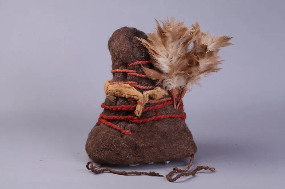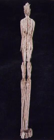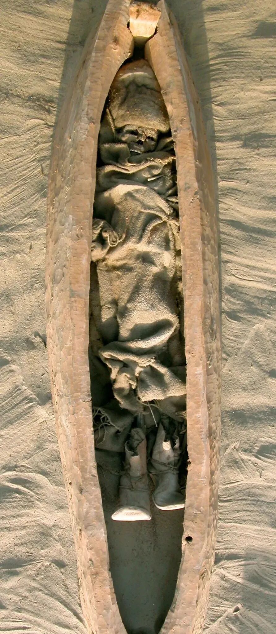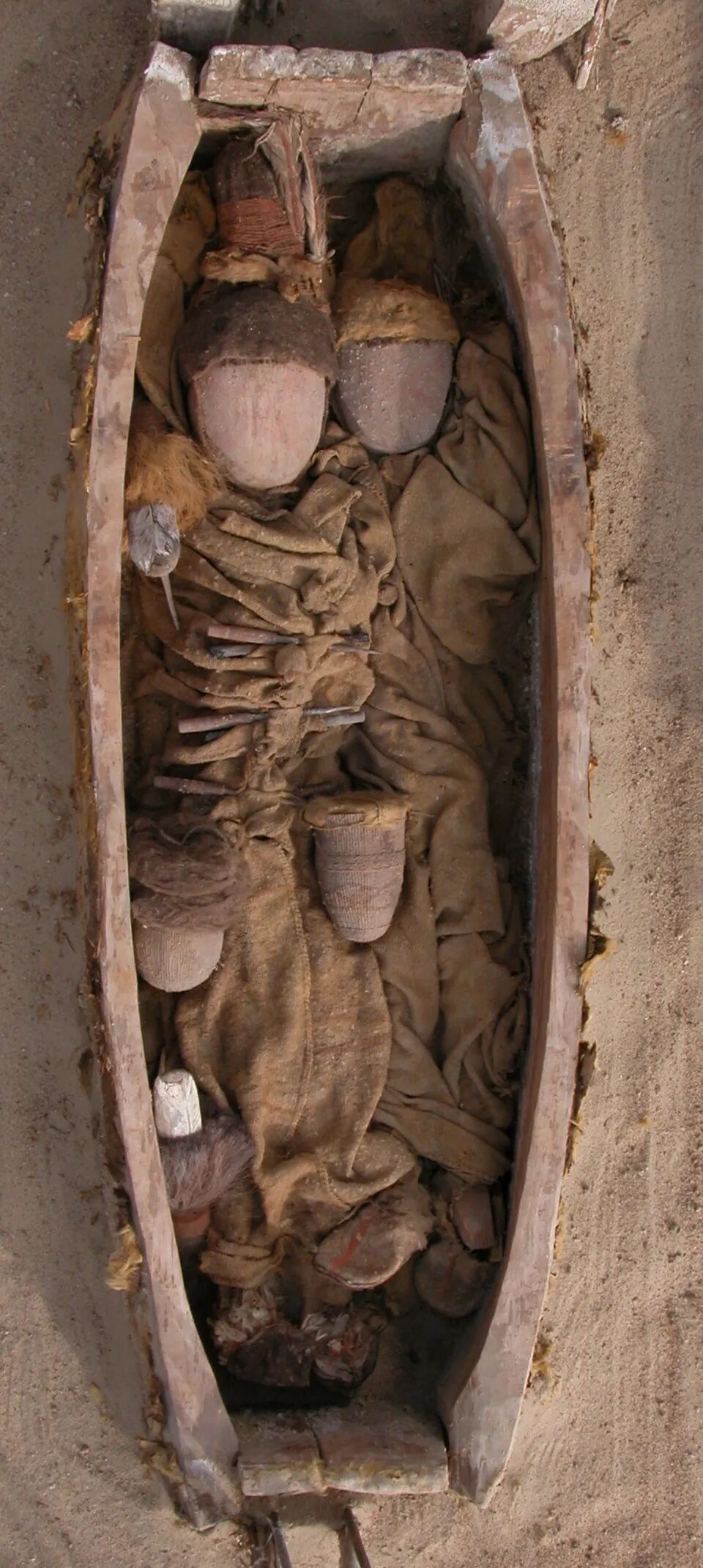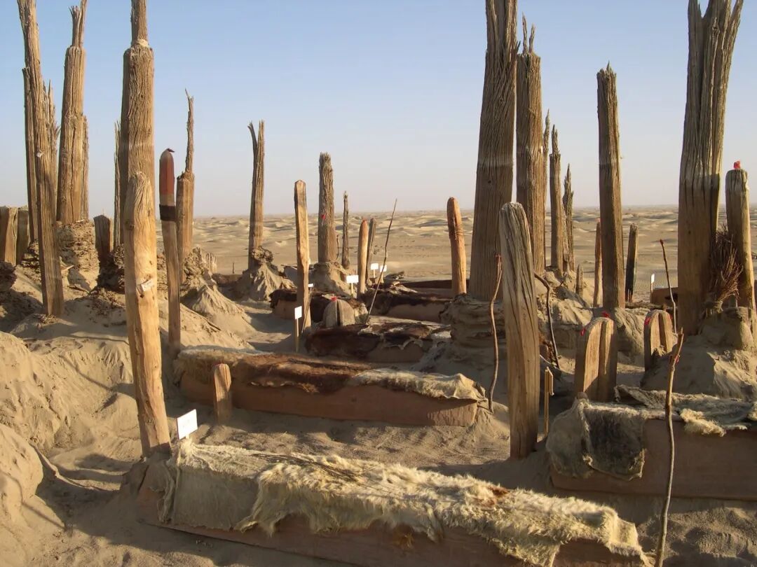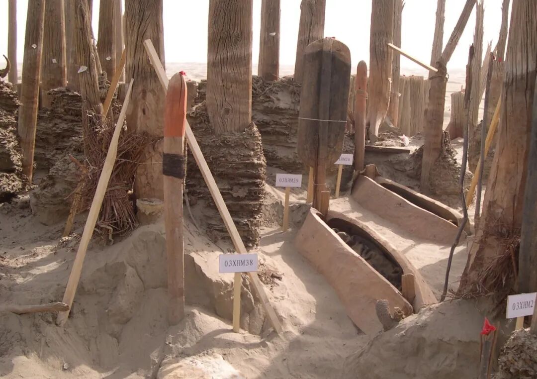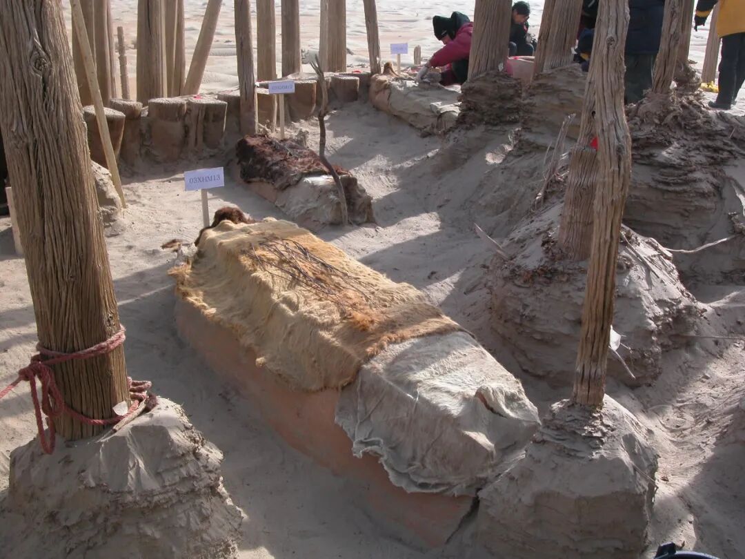 小河墓地出土10余具木尸,还有人首木身的“组装”尸体。有的尸体表面紧裹着动物的毛皮,还做出五官,留有头发,衣著打扮、随葬习俗、随葬品和真人无异。这些特殊的尸体都出自木棺,应为真人的代替品。小河人相信灵魂不死,人体是灵魂的居所,只有完整的躯体才能承载灵魂,才能让死者的灵魂有所归依。