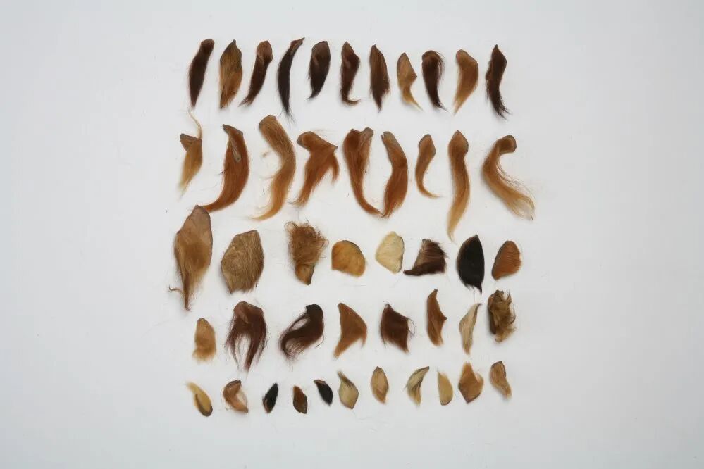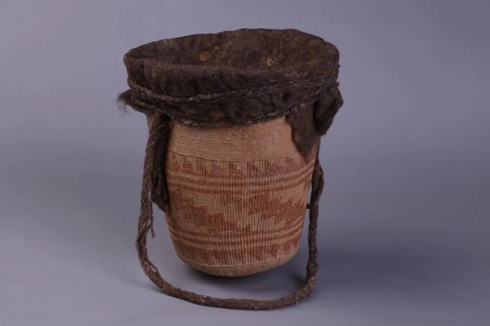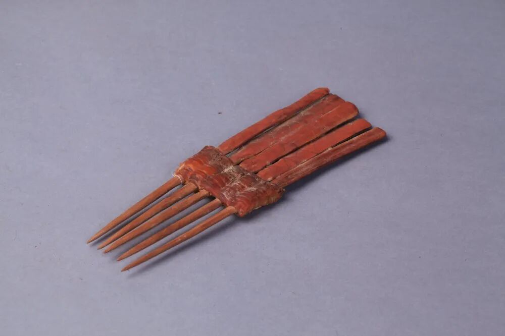 精美的草编篓(左上),木梳(左下),镶铜片的木罐(右上),墓主身上撒动物耳尖(右下)