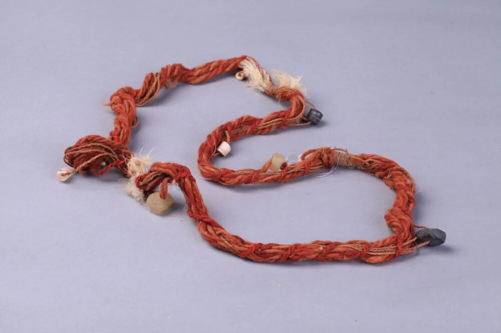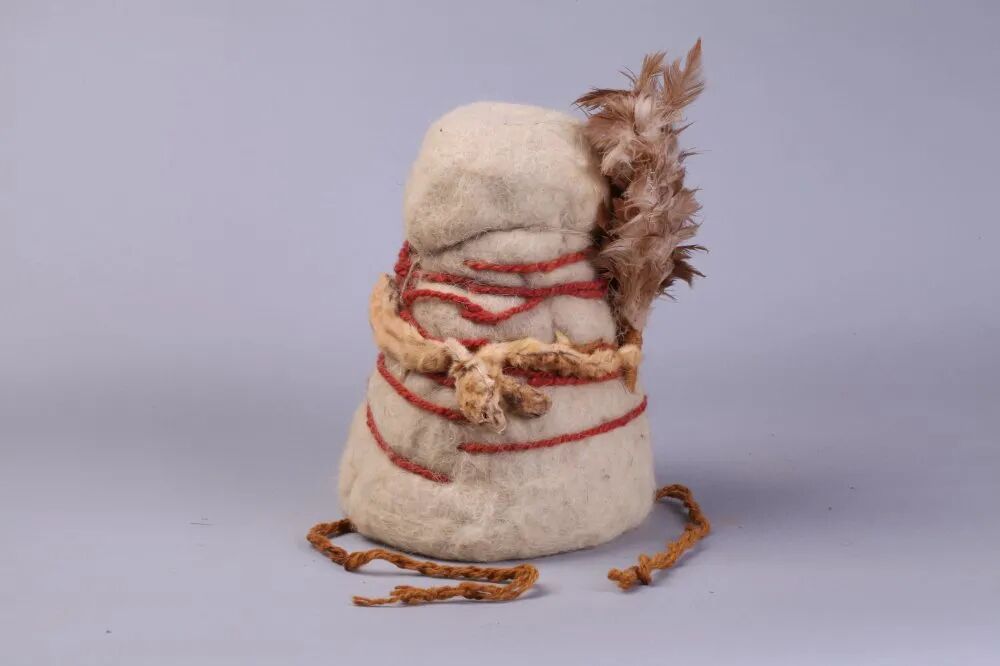 缀玉珠的毛绳项链(左上),皮靴(左中),男性毡帽(左下),玉石手链(右上),女性毡帽(右中),女性腰衣(右下)