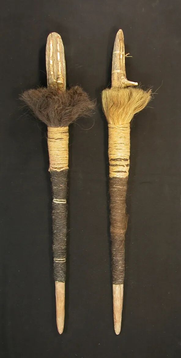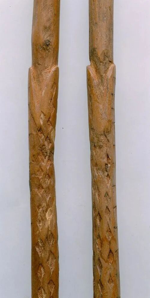 嵌骨雕人面像的法杖(左),蛇形木雕(右)