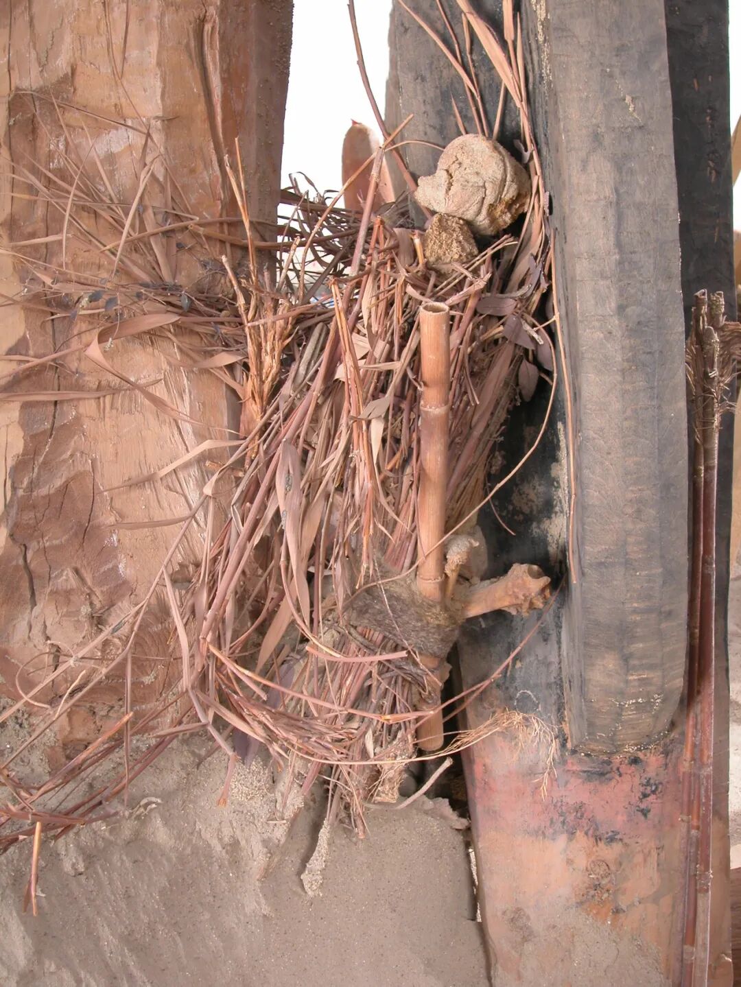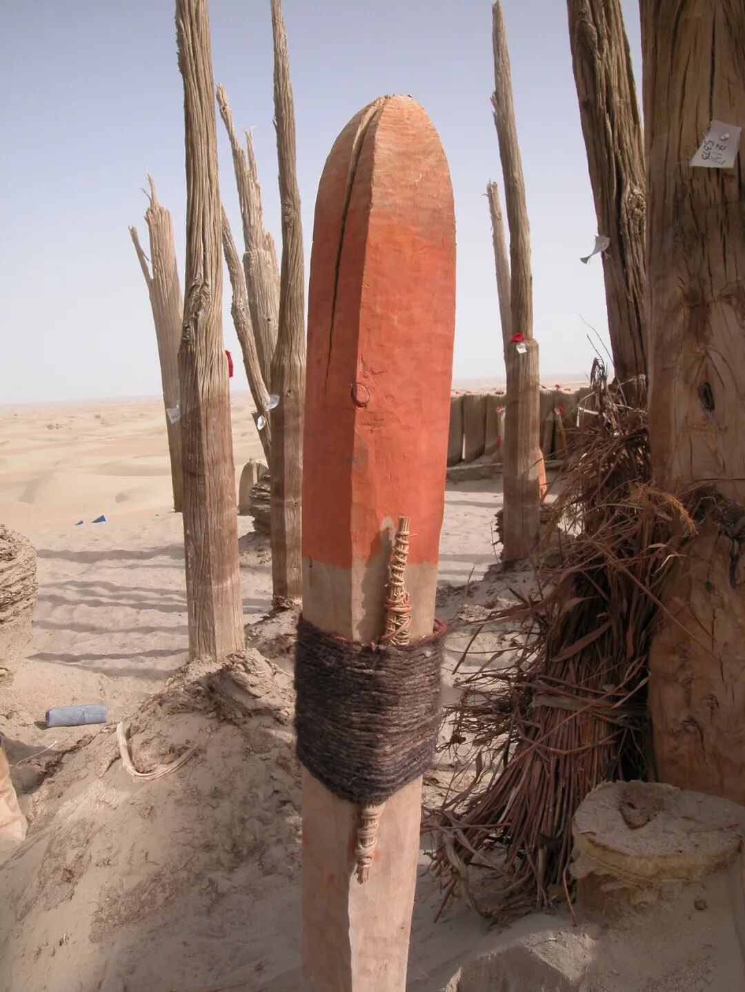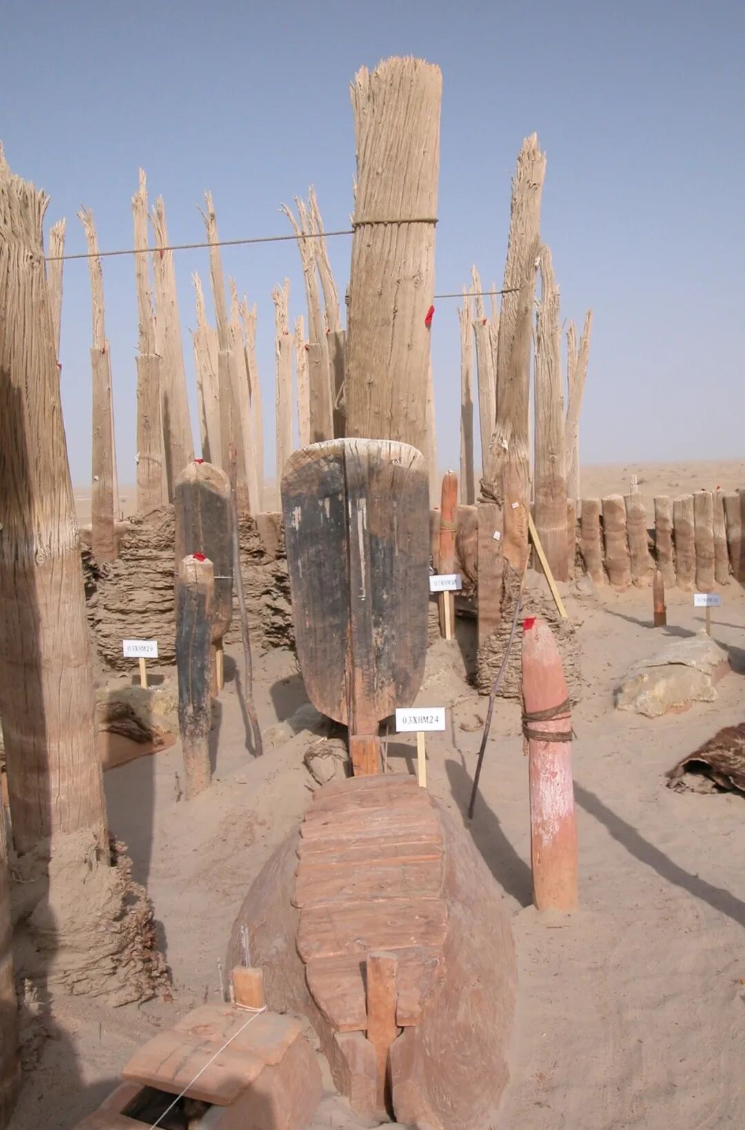 小河墓地是部族神圣的祭祀殿堂。在墓葬棺外男根、女阴立木前,通常还立一根高达4、5米的通体涂红胡杨木柱,推测是具有萨满“通天”意味的神柱,柱端挂涂红牛头或羊头,根部插立芦苇、麻黄、骆驼刺等干旱区植被,摆放羊骨、牛粪、草篓等,这些物品既是向神灵献的祭品,同时也表达祈求丰产的寓意。