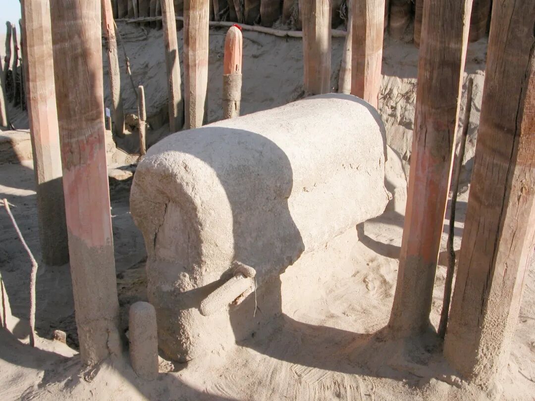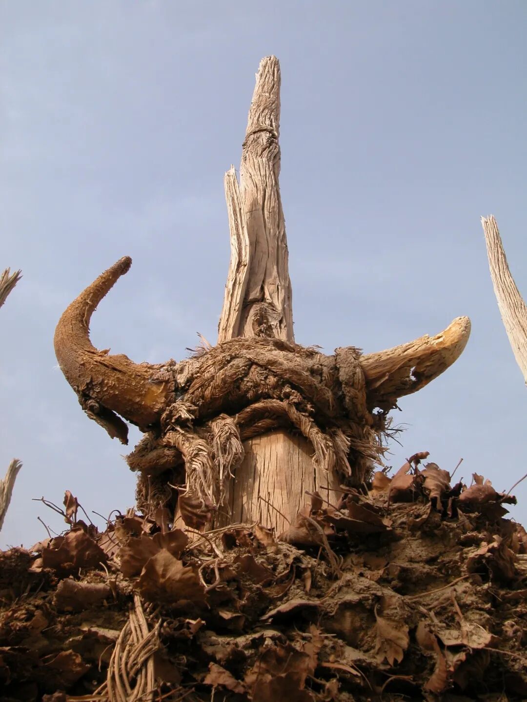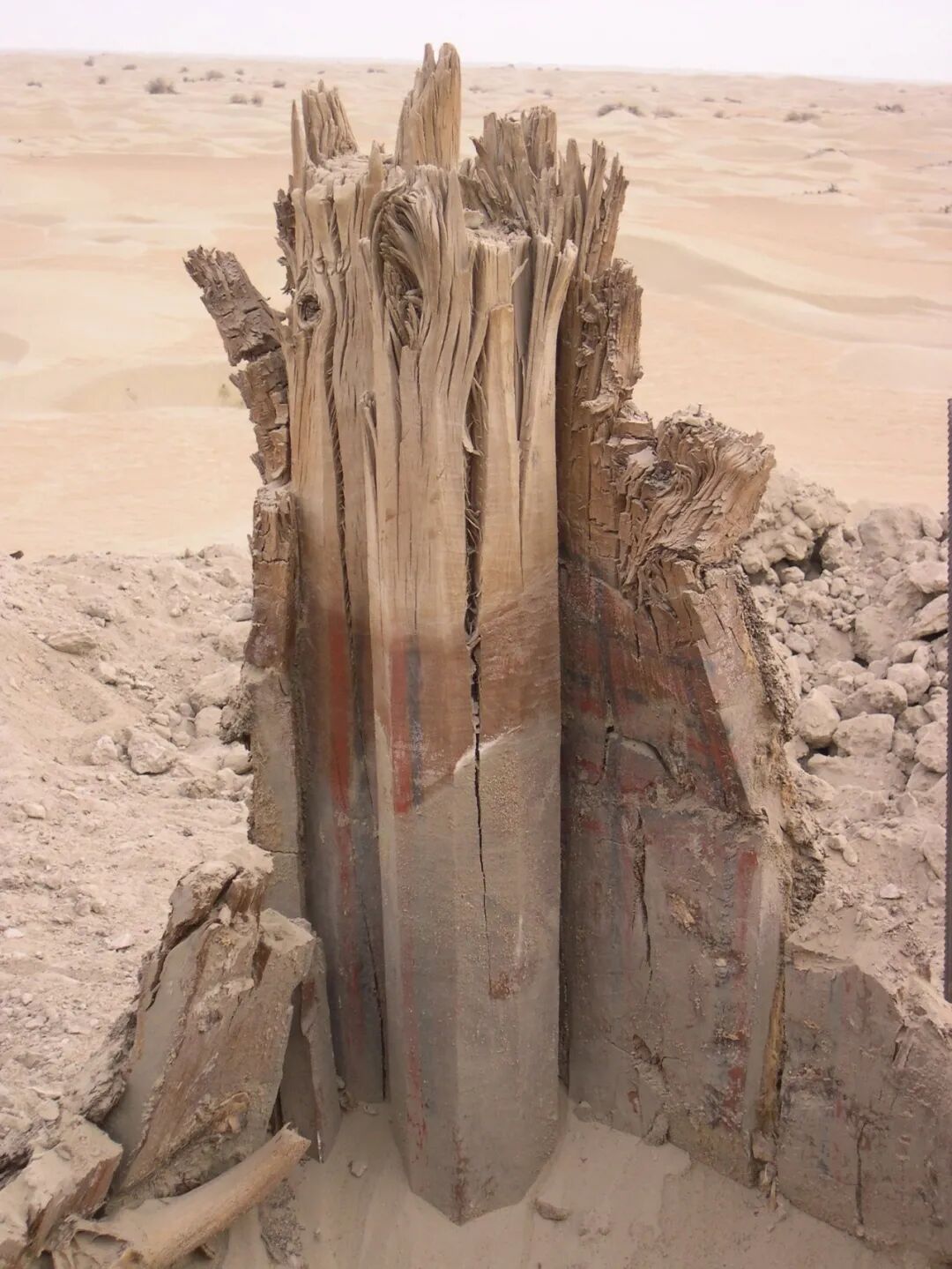 小河墓地是部族神圣的祭祀殿堂。在墓葬棺外男根、女阴立木前,通常还立一根高达4、5米的通体涂红胡杨木柱,推测是具有萨满“通天”意味的神柱,柱端挂涂红牛头或羊头,根部插立芦苇、麻黄、骆驼刺等干旱区植被,摆放羊骨、牛粪、草篓等,这些物品既是向神灵献的祭品,同时也表达祈求丰产的寓意。