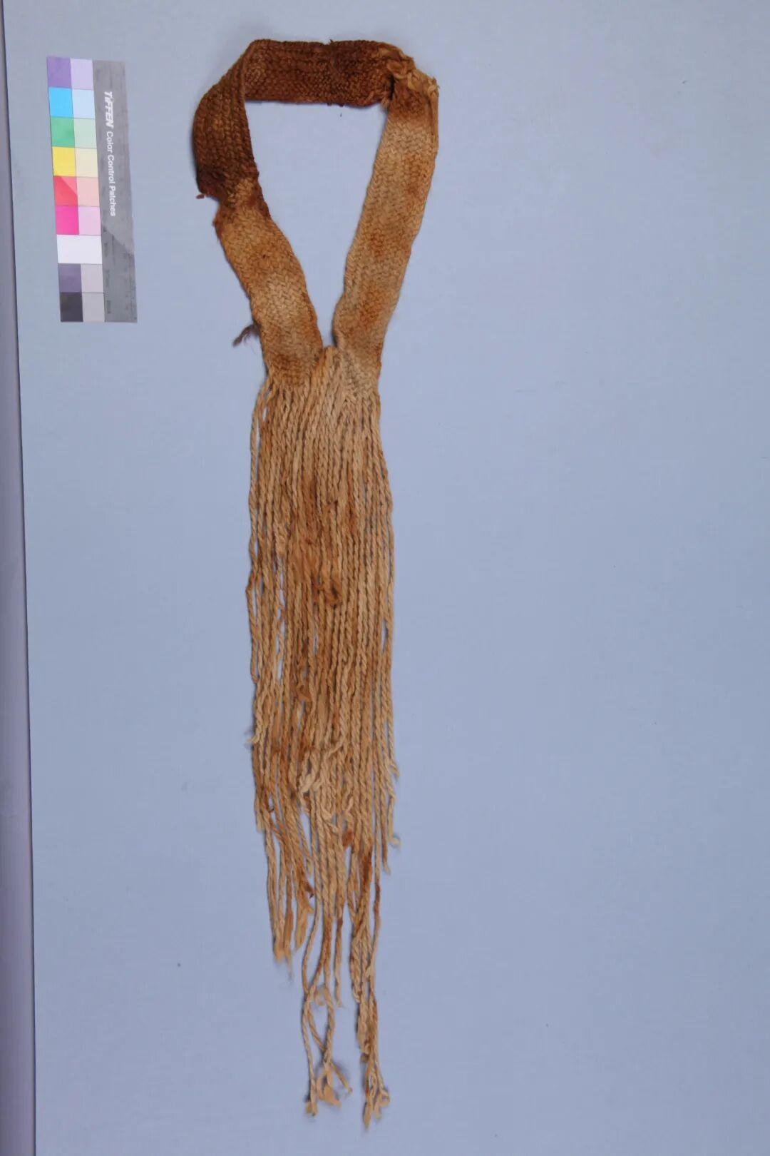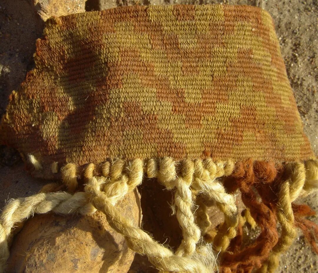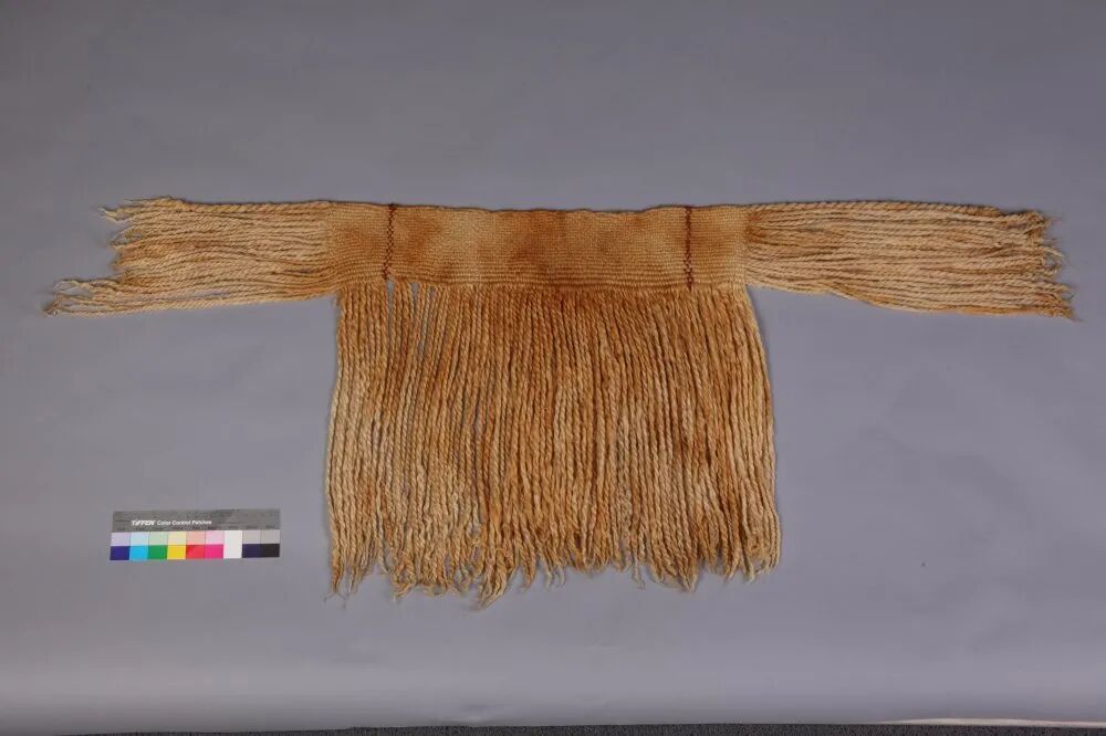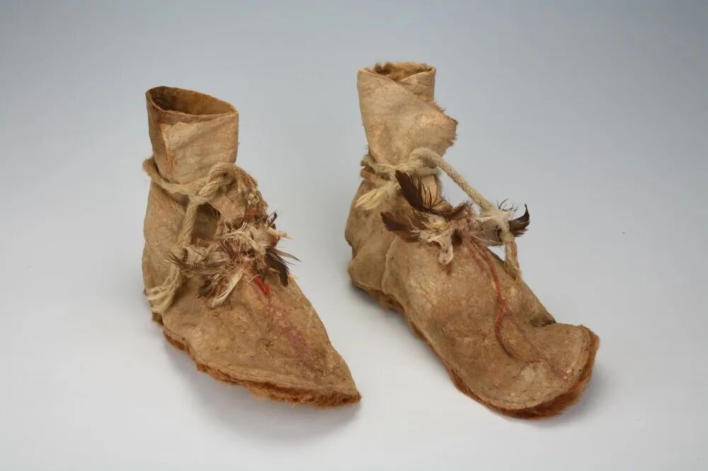 小河人的服饰数百年间几乎没有变化。其头戴毡帽,身裹宽大的毛织斗篷,腰围或如窄带或似短裙的毛织腰衣,足蹬短靴,配缀玉珠的毛绳项链和手链。斗篷和腰衣都是一次织(或编)成的块料型服装,不经过二次裁剪、缝纫,直接围裹、披挂于身,这是人类服装演变史上是最为简单的服饰形式。斗篷和腰衣上或织或编出红色几何纹。毡帽上缝缀毛线、插鸟的翎羽、捆扎伶鼬。这些奇异的装饰,除从装饰文化传统习俗理解外,抑或与原始宗教有关。