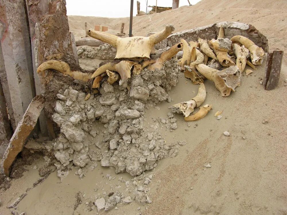 墓室上部出土大量牛头羊头(左上),权杖头(左下),铜镜(右上),木房式墓葬(右下)
