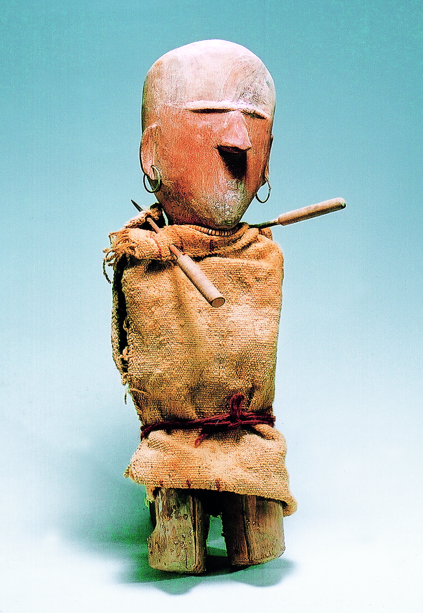 小河墓地是目前中外史前考古发现人形雕像较多的一处遗存,这些人像多与灵魂崇拜有关,各种神偶代表不同的灵魂。长度10-50厘米不等的人像,肢体线条粗犷,穿戴特制的斗篷和毡帽,五官或仅涂划有红色线条,或雕刻眉弓、鼻子,这类木雕人像出自泥壳墓中,为祭祀用神偶;木雕人面像,长度10厘米左右,浮雕五官,眉弓突出,高鼻夸张,面部蒙皮并涂红。这类人面像男性和女性墓中都有出土,很可能是祈求生育的灵偶。