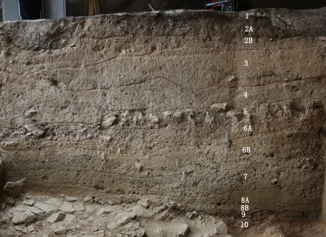 通天洞遗址洞穴堆积较厚,发掘区最深处距地表约3米,已发掘部分划分出为14个地层单位,分为4组。1、2A层分别为早期铁器时期时代和青铜时代地层,2B层出土有很少量的具有细石器技术特点的石制品,他们属于上部文化层。3-5层为自然堆积的粗砂和花岗岩角砾,不见文化遗物。6A、6B、7、8A、8B、9层为旧石器时代文化层,出土有大量石制品和动物骨骼化石,并有原位埋藏的火塘等明确的遗迹现象。10层及以下为自然沉积的黄沙和花岗岩角砾层,尚未见底。