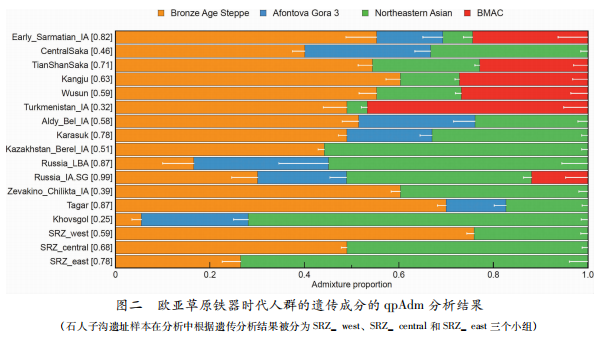 类似结果在qpAdm分析中也有体现。如图二,欧亚草原早期铁器时代各区域人群的祖先成分,均可模拟分为欧亚草原青铜时代、古北亚(Afontova Gora3)、巴克特里亚—马尔吉纳亚考古学综合体(BMAC)和东北亚这4种人群成分的混合。但分析结果表明,各人群内的祖先混合比例存在高差异度。这一现象通常出现某一群体的形成之初,即不同成分来源的混合期。这表明,在早期铁器时代,欧亚草原各区域人群处于持续的大规模流动状态。