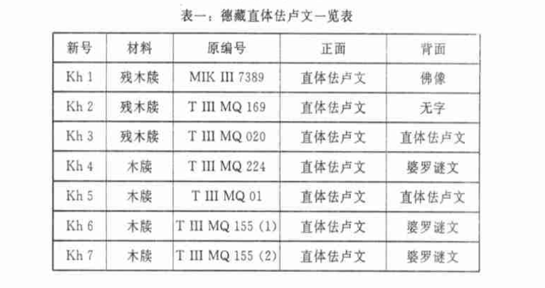 在德国印度学家威勒(Klaus Wille)博士的帮助下,柏林普鲁士文化藏品图书馆东方部主任费斯特勒(Hartmut-Ortwin Feistel)博士从勒柯克收集品中一共找到六件佉卢文木牍。据我们研究,其中两件是吐火罗—犍陀罗双语文书(编号为T III 155.1-2),吐火罗语用婆罗谜文书写,犍陀罗语用直体佉卢文书写。其余四件为直体佉卢文犍陀罗语文书(编号为T III MQ01、020、169和224)。从文书编号可知,这六件文书是德国吐鲁番考察队第三次(皇家第二次)中亚考察期间(1906~1907年),在新疆库车地区克孜尔千佛洞发现的,发现地点在第01、020、155、169和224号遗址。此外,勒柯克收集品中还有一件直体佉卢文书。这件文书背面绘有一幅佛像,所以当作艺术品收藏在柏林印度艺术博物馆。这件文书没有原始编号,博物馆藏品编号为MIK III 7389。文书形式与勒柯克收集品另外几件佉卢文书没什么差别,估计是和其他几件直体佉卢文一起在克孜尔石窟寺发现的。据印度学者跋达查娅(C. Bhattacharya)调查,这件文书出自克孜尔石窟所谓Last Temple(最后神庙)或Last Enclosure(最后围墙),时代断在公元7世纪。[8]费斯特勒博士寄来了这些文书的彩色照片,并写信介绍了这些文书各方面情况。同时,柏林印度艺术博物馆馆长亚尔迪茨(Marianne Yaldiz)寄来她们收藏的带佛像的那件文书的照片。为便于研究,我们把这七件文书的相关数据列表如下:[9]