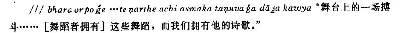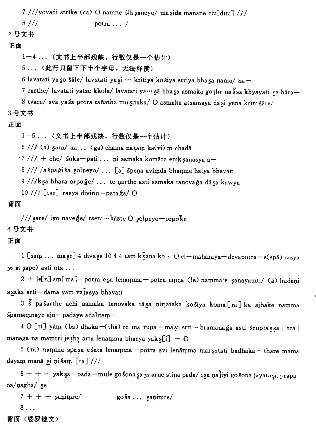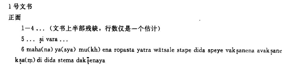 既然这文书第6行出现naṭaṃ(=梵语naṭa,舞蹈者)和ka(vi)ṃ(=梵语kavi,歌手或诗人)等,[19]那么同一文书第9行那个含义不明的ṇarthe可能是梵语narṭa(舞蹈)一词的俗语形式,而3号文书很可能出自马鸣某个剧本。可惜过于残破,无法验证它究竟出自马鸣哪个作品。