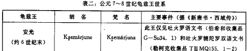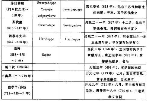 勒柯克收集品6号文书的吐火罗语部分提到另一位龟兹王。相关句子读作:śak kṣuna kṣe[mārjuni lānti]“国王安光(Kṣemārjune)在位第六年”。法国东方学家伯希和(P. Pelliot)在库车发现的一件吐火罗语文书(编号G-Su34.1)也提到这位龟兹王。据法国学者皮诺(G.-J. Pinault)解读,相关句子读作:skas kṣuntsa kṣemārjuni lānti yakwe-pikulne śkan̄ce meṃne“国王安光(Kṣemārjune)在位六年十月”。[26]考虑到6号文书和4-5号文书都写有直体佉卢文,安光和苏伐勃駃在位年代应相去不远。关于这个时期的龟兹王世系,《新唐书·西域传》有详细记载。该书提到6世纪末至8世纪初,一共有七位龟兹王,但是没有一个名字和安光的名字相符。由此推测,安光统治龟兹的年代应在苏伐勃駃之前,也就是公元6世纪末。为便于今后的研究,我们把《新唐书·西域传》、吐火罗语文书和直体佉卢文提到的龟兹王列表如下:
