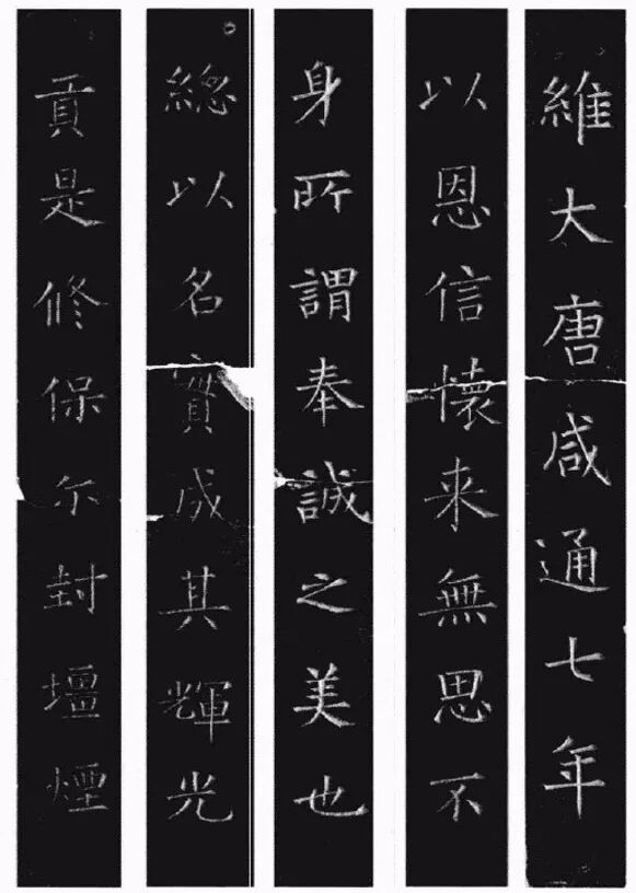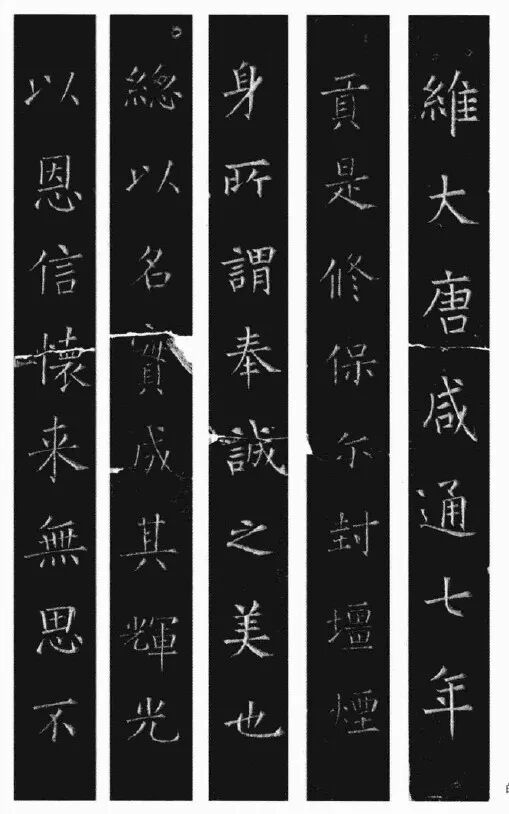 这明显不是正确的排列顺序。由于是断简残片,已无法从中获知其册文之全貌,日中学者对5残简如何排序也意见不一。枡本哲排序为“维大唐咸通七年/以恩信怀来无思不/贡是修保尔封疆烟/总以名实成其辉光/身所谓奉诚之美也”,刘凤翥则做“维大唐咸通七年/贡是修保尔封疆烟/身所谓奉诚之美也/总以名实成其辉光/以恩信怀来无思不”(图6)。笔者以为,结合唐代册书书式的研究成果,并参照存世唐册回鹘可汗书,以及《立黠戛斯为可汗制》,对此仍有进一步探讨的空间。