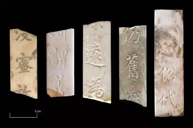 图4 蒙德联合考古队在哈喇巴拉嘎斯发现的部分玉册残片。左一是回鹘可汗尊号局部“没蜜施”(https://www.dainst.org/dai/meldungen)