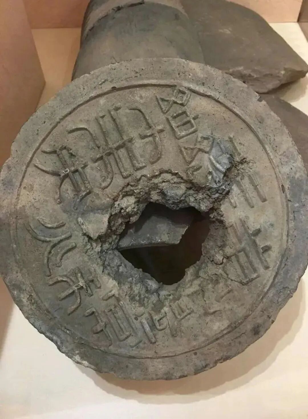 特别值得注意的是筒瓦(沿屋顶自上而下铺盖底层板瓦之间的接缝)的圆形瓦当……所有瓦当都有同样的汉字,是用两块制作相似的印模在泥坯未干时压印出来的。这些瓦当的拓片、摹本和照片,已交由阿列克谢耶夫研究。