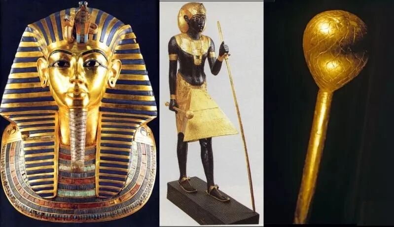古埃及图坦卡蒙法老墓出土的金面具、木雕像和鎏金权杖