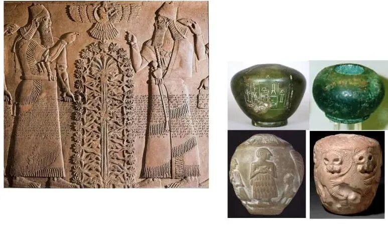 左:亚述王浮雕;右:不同质地的高等级权杖头