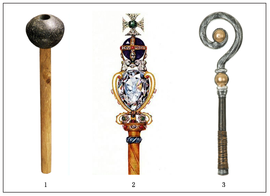 西方的三种权杖:1、古代权杖;2、现代英国女王的权杖;3、曲柄杖(牧杖)