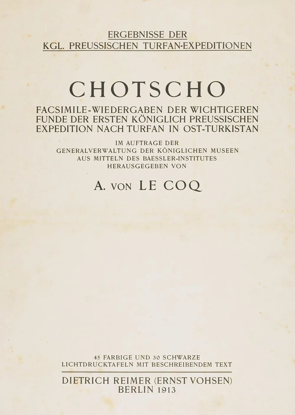这是本大型、极其豪华的目录画册,汇总了由勒·科克(Le Kok)领导的德国吐鲁番探险考察的结果,它包含大量在Hocho(高昌的旧城堡),柏孜克里克(Bezeklik)千佛洞和吐鲁番(Turfan)地区的吐峪沟(Toyuk)发掘的壁画,雕像和古代文献的照片。这本书之所以宝贵,还由于其中所介绍的艺术品原件,有一半左右都毁于二战之中,特别是本书大部分印版的千佛洞资料,后来因二战期间盟军对柏林的空袭轰炸而实物丢失葬于战火,它包括摩尼教和内斯托里亚的基督教文物以及在霍乔发现的古代文献。