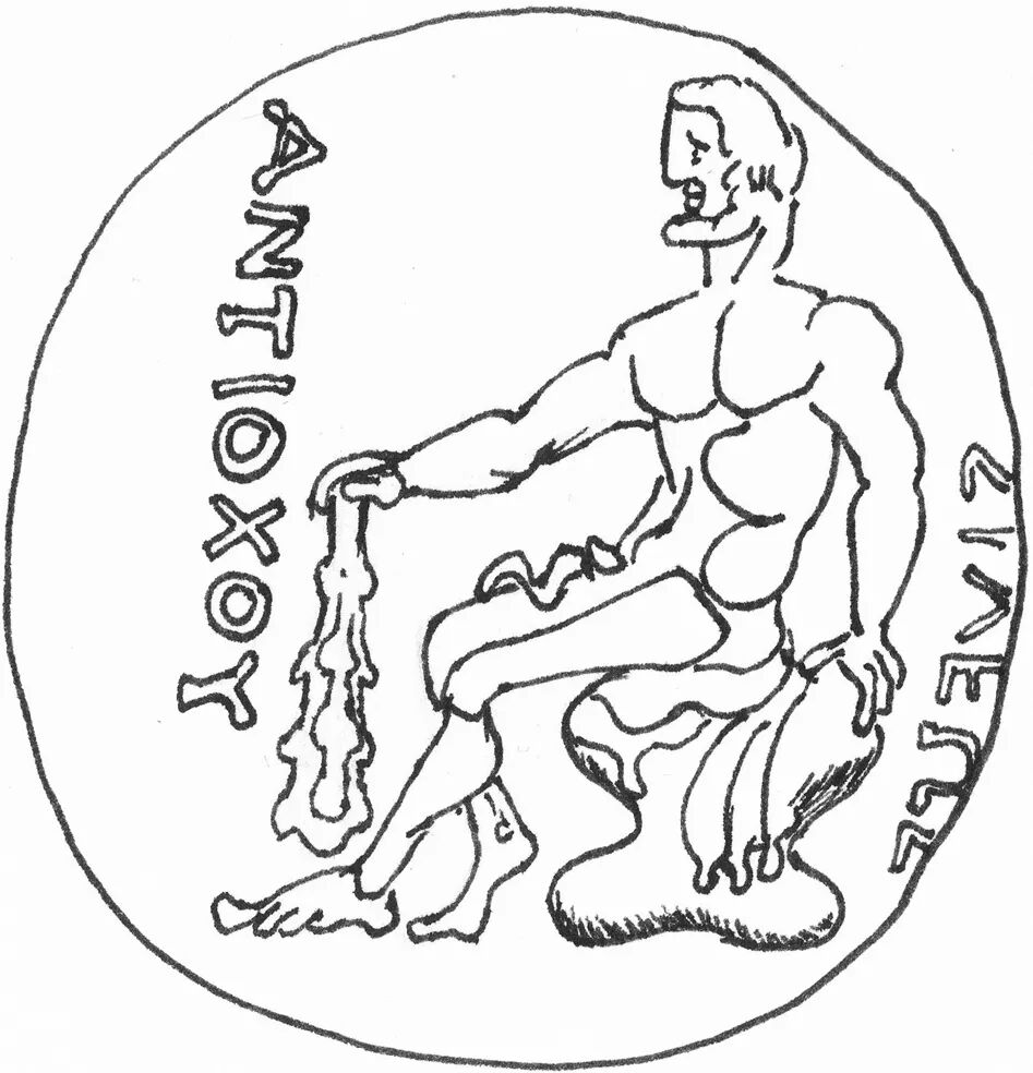 三位希腊神手持武器的坐像具有高度相似的动作,应该是出自于相同的艺术题材,即“赫拉克勒斯的休憩”(Herakles Epitrapezios)。这是一种桌面铜摆件,由希腊雕塑家吕西波斯(Lysippos)设计而成。[34]雕像表现的是赫拉克勒斯经历了一番艰辛的劳作之后坐下来休息。此时他已取得了伟大的成就,于是手举酒杯来庆祝。然而他的武器木棒并没有离手,有一种枕戈待旦、蓄势待发之感。这是一尊献给亚历山大三世的礼物,寓意亚历山大经历了一系列军事活动之后,得以坐享天下。希腊化国王都是通过武力征服来建立国家,并且都以亚历山大的继承者自居。所以安条克一世选择借用“赫拉克勒斯的休憩”艺术形象来设计他的个人钱币,无疑是想利用这种雕像主题所传达的军事与政治喻意,证明塞琉古家族是叙利亚的合法继承者。[35]