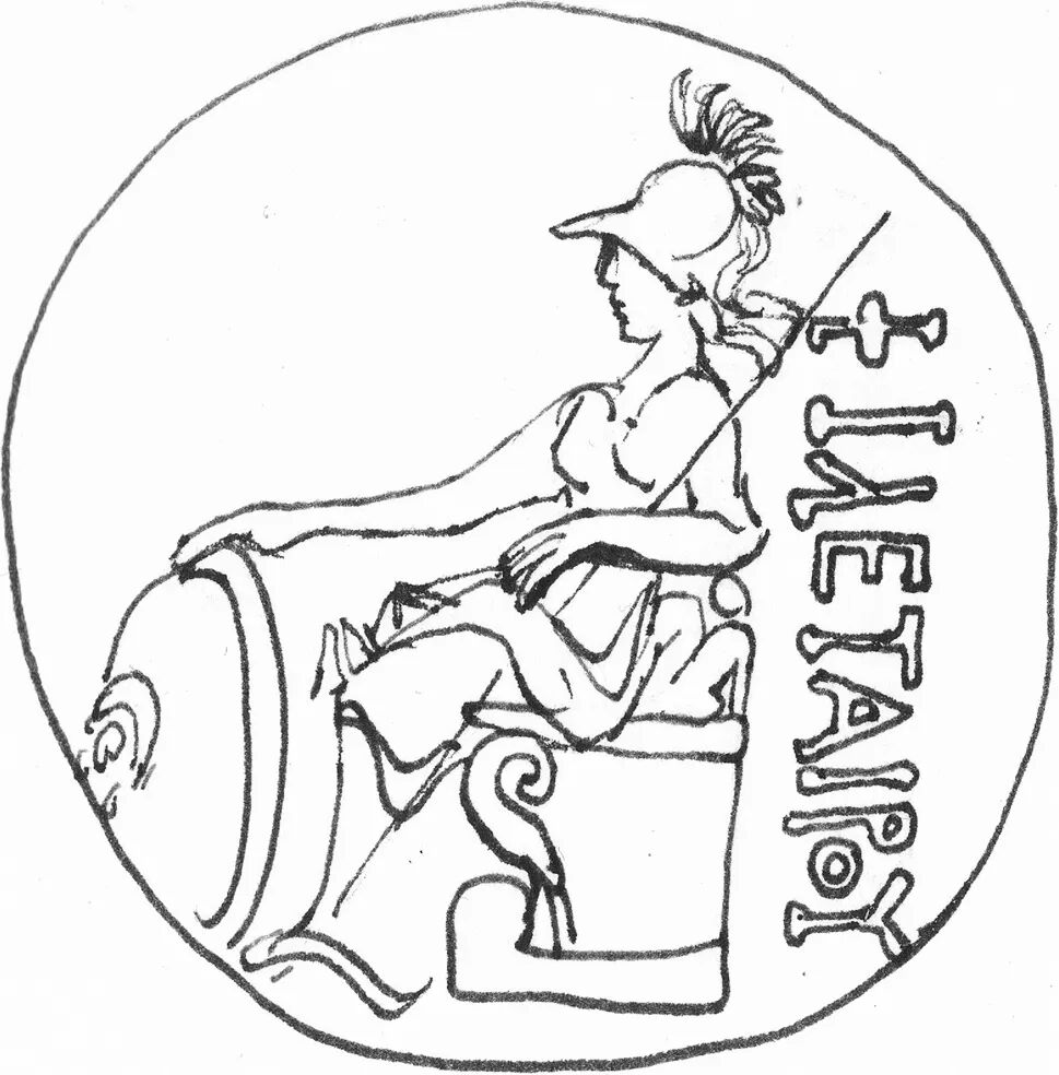 不容忽视的是,安条克一世时期,与阿波罗坐像类型同时出现的还有赫拉克勒斯坐像类型和雅典娜坐像类型[33](图四和图五)。赫拉克勒斯坐在石头上,右手前伸,将木棒拄在地上,左手向后扶在石头上,支撑着身体。雅典娜坐在王座上,右手前伸,扶着印有戈尔工的盾牌,将它立在地上。她的左手肘向后倚靠着座椅上的斯芬克斯扶手,有一支长枪靠在她的左肩上。这三种类型钱币的正面都是安条克一世头戴王带的侧面肖像,但是钱币背面的铭文有所不同。阿波罗与赫拉克勒斯类型的铭文都是ΒΑΣΙΛΕΩΣΑΝΤΙΟΧΟΥ(属于安条克国王的),而雅典娜钱币类型的铭文是ΦΙΛΕΤΑΙΡΟΥ(属于菲莱泰罗斯的)。菲莱泰罗斯(Philetaerus)是帕加马王朝的奠基者,并宣示臣服于塞琉古王朝。