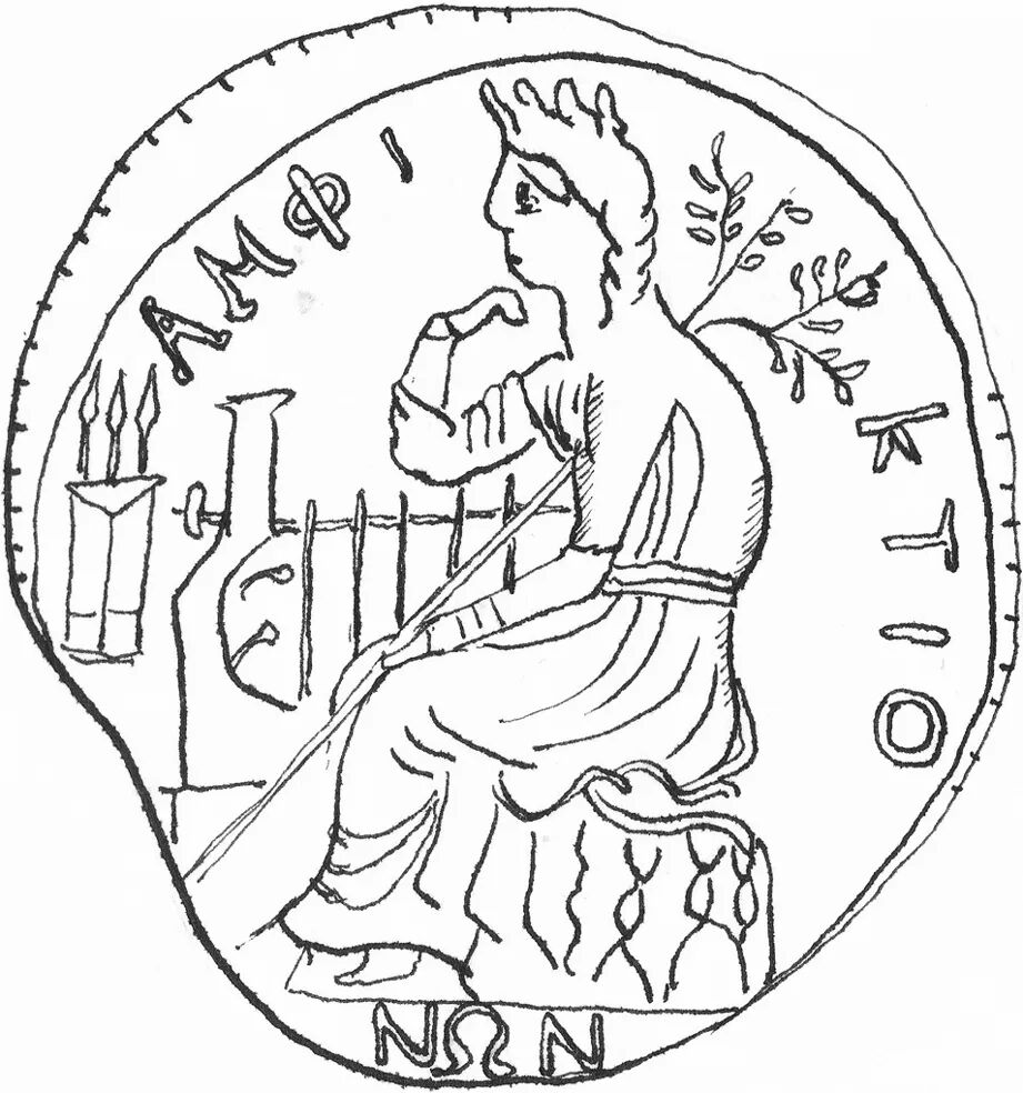 公元前5世纪左右,阿波罗型钱币广泛分布在希腊以及与希腊有商贸往来和文化交流的地区。阿波罗在钱币上的表现形式主要有侧面头像和全身像两种。头戴橄榄枝桂冠的无须青年侧面头像是阿波罗型钱币的一种固定样式,艺术风格会根据钱币发行地的不同而有所差异。阿波罗全身像则通过阿波罗手中的物品,更具体地表现了阿波罗作为音乐神、牧神和德尔斐(Delphi)保护神的形象。比如大希腊地区的塔兰托(Tarenrum)发行了音乐神阿波罗的钱币。阿波罗单膝跪地,左手怀抱四弦里拉琴,右手捏着风信子花,缅怀已故挚友雅辛托斯(Hyacinth)。同为大希腊地区的考洛尼亚(Caulonia)的钱币刻画了手持橄榄枝,与一头雄鹿相伴的牧神阿波罗。在希腊本土的德尔斐钱币上,阿波罗怀抱橄榄枝,侧身坐在肚脐石(Omphalos)上,象征着阿波罗的祭祀三脚架(tripod)和里拉琴也围绕在阿波罗的前后(见图二)。[31]