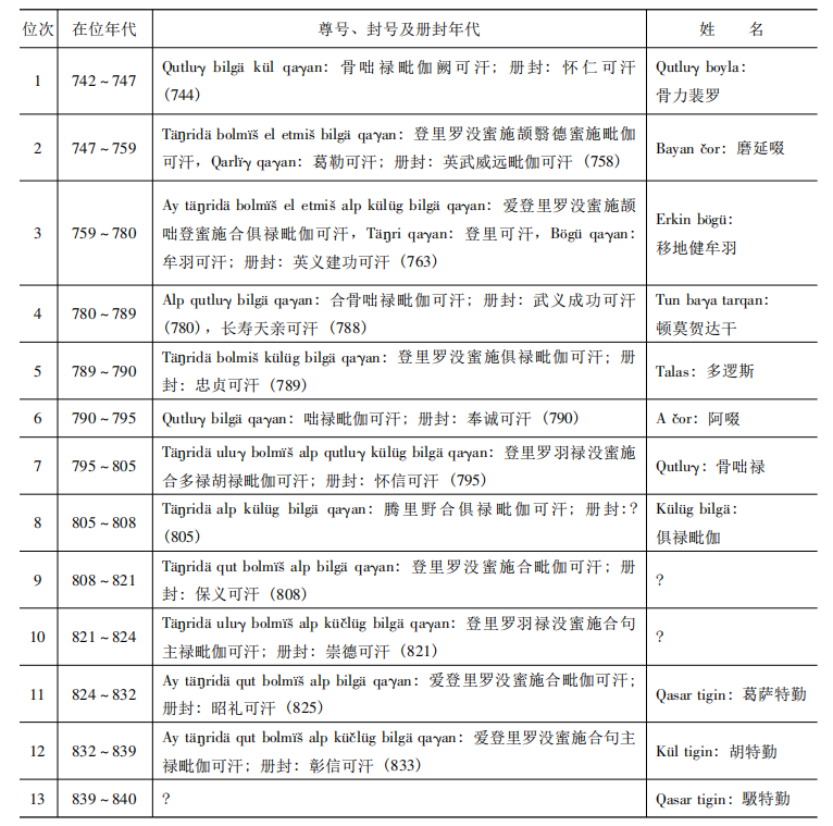 为了弄清葛啜王子的世袭关系,根据汉文史籍、突厥文碑铭的记载及各国学者的考证,漠北回鹘汗国的可汗谱系可列表如下: