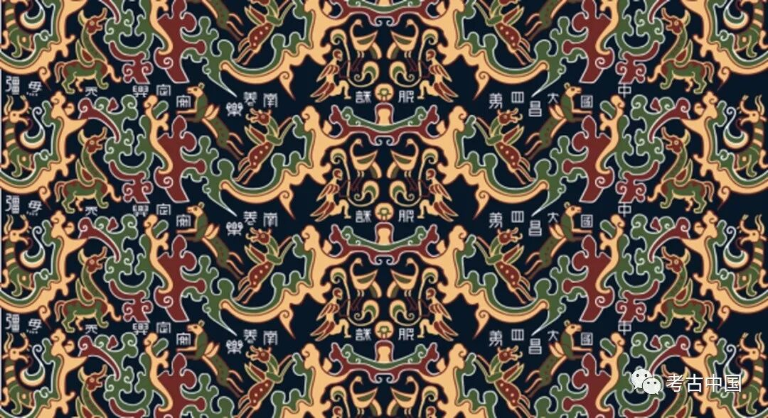 另一件织锦的纹样复原图,同样也有各类变形的云气纹,云气绕缭中还有一些神奇的动物,这些动物应该是诸如麒麟、白虎之类的神兽,身上还长着一对小小的翅膀。其中的汉字寓意依然很高大上——中国大昌四夷服诛南羌乐安定与天无疆,表示对中原政府繁荣昌盛、四海安定的祝福与祈愿。