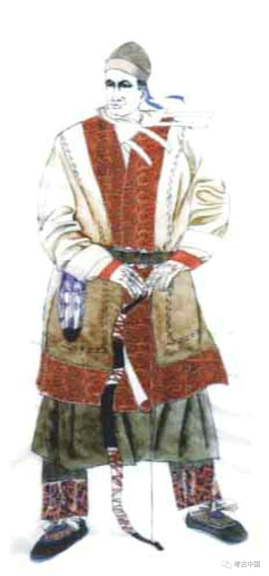 《盗墓笔记》或者《鬼吹灯》等悬疑小说中,有一个古国叫精绝,其实这是一个西域国家的名称,也就是现在所说的尼雅。这就是精绝国的贵族,从他身上穿着的衣服来看,上衣的领子和袖子,裤子的裤脚边,都是用漂亮的织锦装饰着,而正身比较费面料的正身,往往采用比较便宜的绢或者当地产的比较粗糙的毛布制成,也许这就是所谓的“领袖风采”。