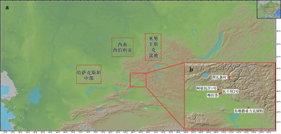 (a,周边集中开展过骨骼同位素分析的区域;b,本文所涉及阿勒泰地区遗址分布图)
