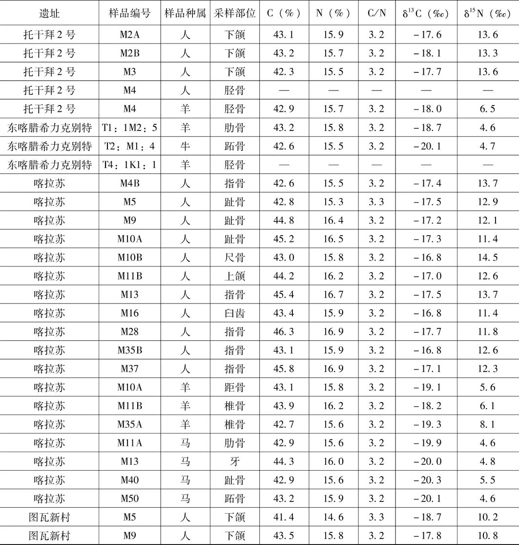 一般而言,骨骼受埋藏环境和时间的影响,骨胶原会发生不同程度的降解,骨胶原产率和碳氮比可以判断所测试样品是否可用于食谱重建。对4个遗址的28个骨骼样品进行骨胶原提取,除了托干拜2号和东喀腊希力克别特墓地各有1例样品因保存状况太差提取失败。其余的26个样品保存良好,骨胶原产率约为2%~13%。骨胶原中C元素的百分含量为41%~46%,N元素为14%~17%,C、N摩尔比为3.2~3.3,处在可接受范围内,由此可以判断所得骨胶原未受污染,[13]可用于食谱重建和营养级分析。分析所得各遗址样品的同位素数据及其采样部位等见表1和图2。以下就同位素揭示的人群食物结构、生业模式特点等分时段展开讨论。