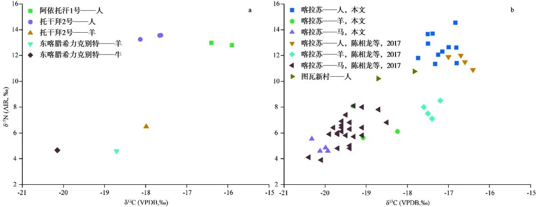 喀拉苏和图瓦新村墓地均包含多个时代墓葬,下文讨论的材料仅涉及早期铁器时代。与喀拉苏墓地已发表的食谱重建结果[20]相比,本文更加侧重对人骨同位素所揭示的生业模式的探讨。为了讨论方便,下文凡是关于喀拉苏墓地的同位素情况的介绍,均为两个研究的综合,但在图中两个研究得出的数据分别标注(图3b)。