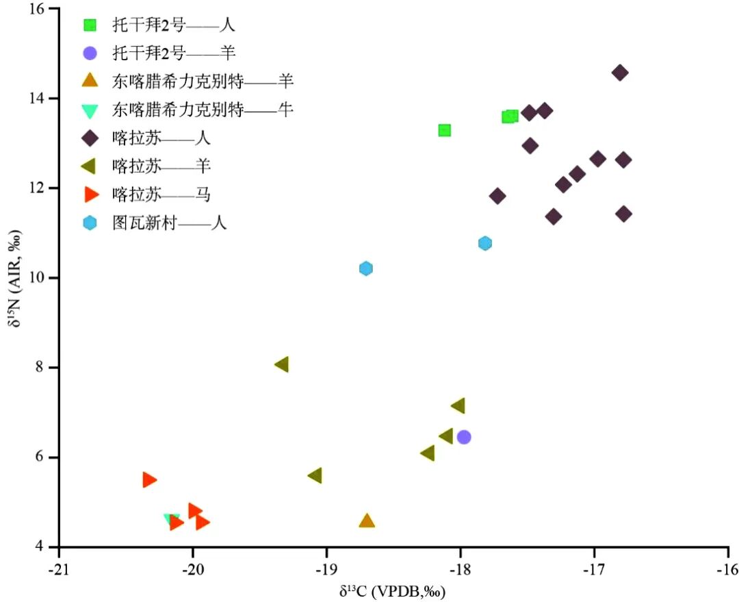 喀拉苏墓地共计15个人骨样品的碳同位素平均值为-17.1±0.4‰,显示该人群主要依赖C3来源的食物,但是几乎所有个体都摄入了少量C4来源的食物。图瓦新村2个人骨样品的碳同位素数据(-18.7‰和-17.8‰)表明所分析个体生前食物中几乎不见C4来源的食物。