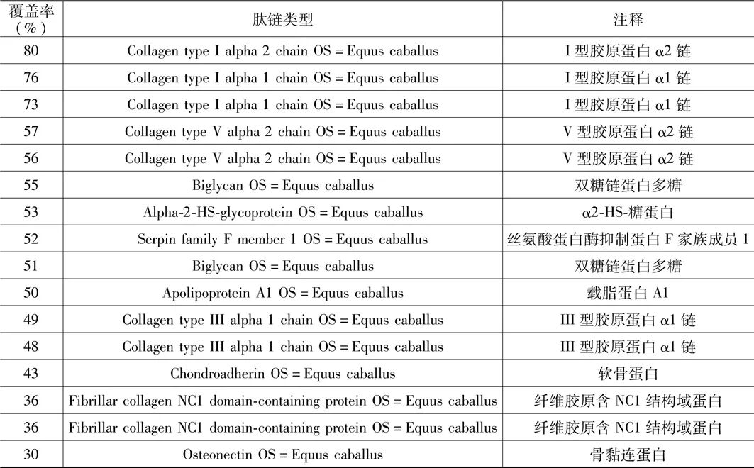 本次测试共产生了318种肽链,均属于家马(Equus caballus)。结合胰蛋白酶分析,我们获取了高覆盖率(80%)的家马I型胶原蛋白序列。如表二所示,覆盖率超过30%的肽链中,除了I型胶原蛋白,还检测到家马的其他类型胶原蛋白(III型和V型胶原蛋白)和非胶原蛋白(双糖链蛋白多糖、α2-HS-糖蛋白、丝氨酸蛋白酶抑制蛋白F家族成员1、载脂蛋白A1、软骨蛋白、纤维胶原含NC1结构域蛋白、骨黏连蛋白)。这些肽链都与家马的骨骼形成、发育有关。
