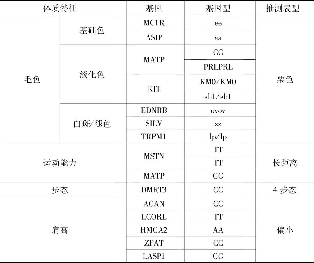 表三 阿勒泰依希根殉马的基因型与表型特征