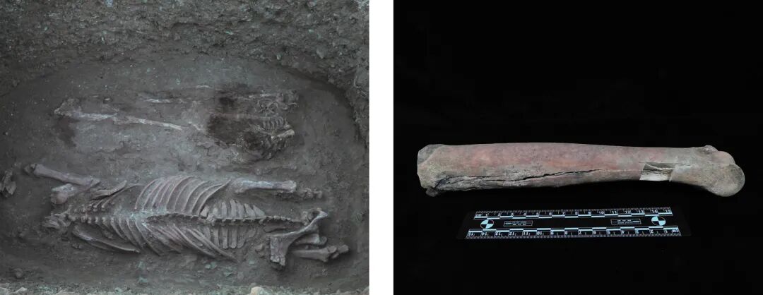 (左图,依希根M6墓地出土马骨;右图,本次检测所用材料)