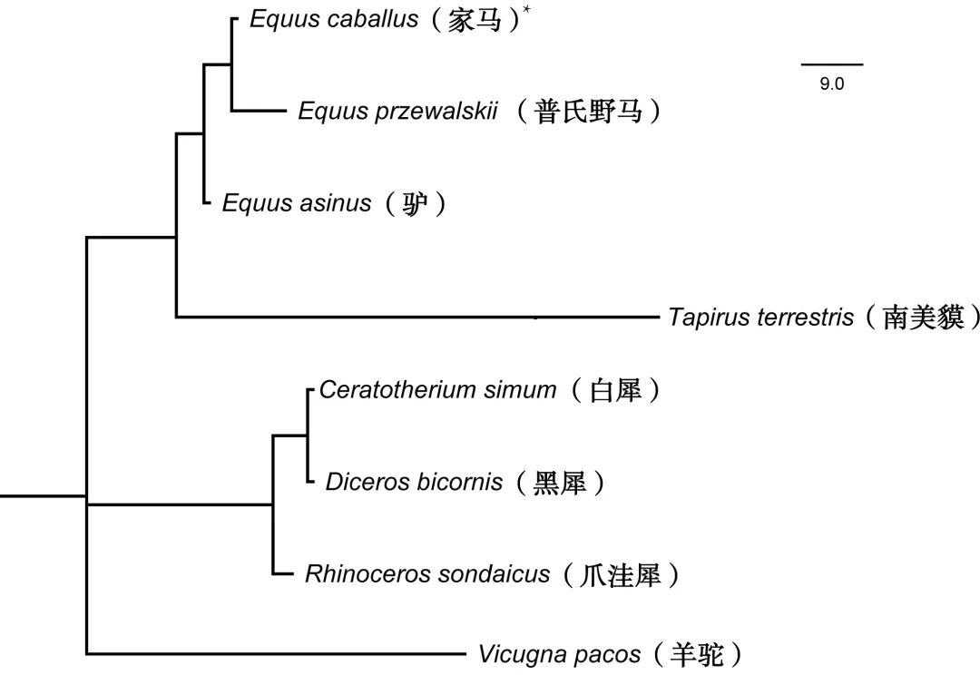 基于I型胶原蛋白数据集,我们采用最大简约法构建了系统发育树(图二),偶蹄类的羊驼作为外类群。系统发生结果显示,本文研究样本阿勒泰依希根殉马与家马I型胶原蛋白的参考序列完全一致,与普氏野马形成一个单系分支,并与其他类群分开。