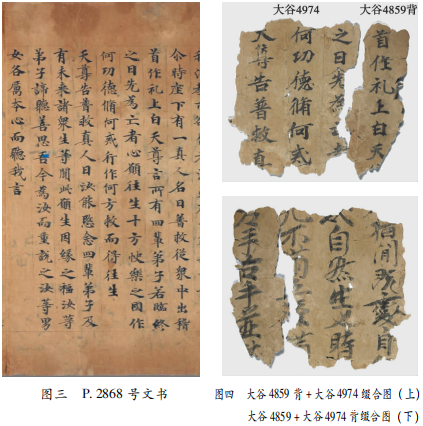 以上两件残片正、背笔迹一致,大谷4974号“者”字右侧墨点残存于大谷4859号左下角,大谷4974号卷背的“五”字下横左半恰在大谷4859号右侧,因此两件残片可以直接缀合,缀合图及与P.2868的对比图如图三、图四。