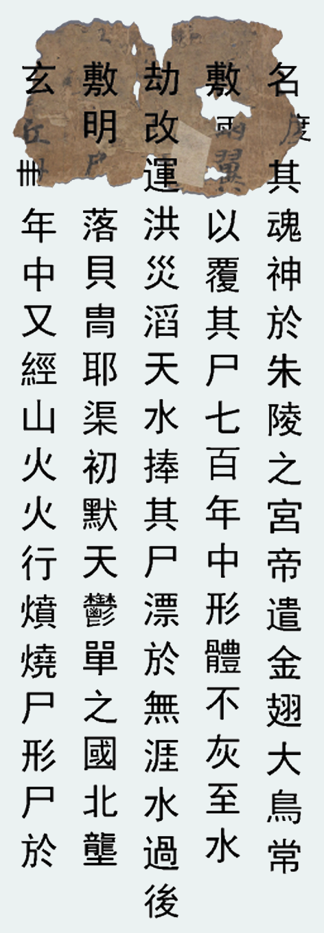 第1行“五篇真”下残存一点一横,应即“文”字残画。“灵宝五篇真文”是所谓的“天文”,是整个灵宝经的基础,[7]早期古灵宝经中多提到这一“天文”,如P.2730《洞玄灵宝长夜之府九幽玉匮明真科》:“帝主国土灾疾兵寇、危急厄难,当丹书灵宝真文五篇于中夜(庭),五案置五方,一案请一篇真文。”P.2606《太上洞玄灵宝无量度人上品妙经》:“元始安镇,敷落五篇。赤书玉字,八威龙文。”P.2865《太上灵宝洞玄灭度五练生尸经》:“中元天中南浮梨世界,有道士姓王,字度明。少出游学,从屠真公受五篇文升仙之传。”类似之例极多,不烦再举。第2行“得上升”,应即上升南宫、上升玉京之类。因此,本卷必为道教灵宝类佚经。