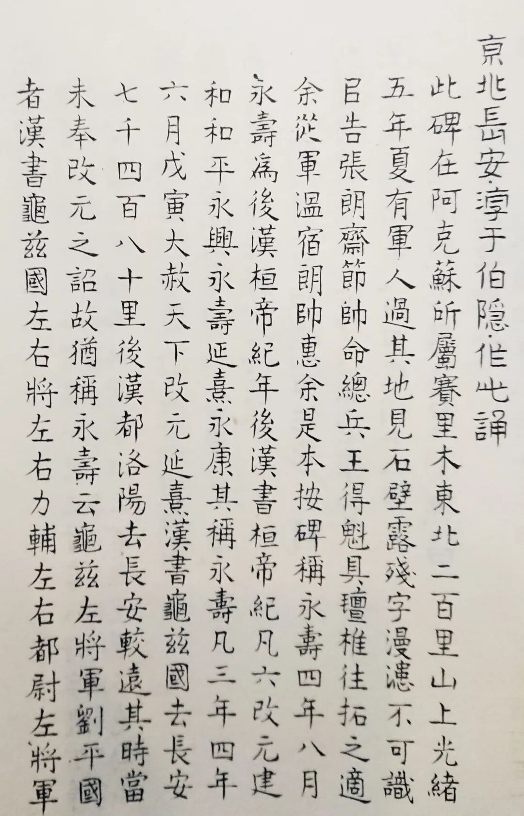 此碑屹立荒裔,沈霾千年。光绪初,先君得初拓本,携之京师。族父澂园尚书树铭为绘《乌垒访碑图》,并系以诗,同时题咏甚多。越庚寅(光绪十六年,1890),先君权拜城县事,碑即在辖境,复手拓数十本,以贻海内金石家。上海重印珂罗版,为吴趋祝氏藏本,上有先君印章,即庚寅手拓本也。并有田北湖、叶菊裳两家释跋,考据详确,可谓淹雅。惟皆据古籍,而未履今地,究不若先君原跋之简要。以曾身历其境,目击而手拓之,不止如读索靖,坐卧其下三日也。敬录原跋,足以息纷纭。抚兹手泽之存,弥重楹书之守。并乞知好,别绘访碑册图,广征题咏。因附记纸尾云。