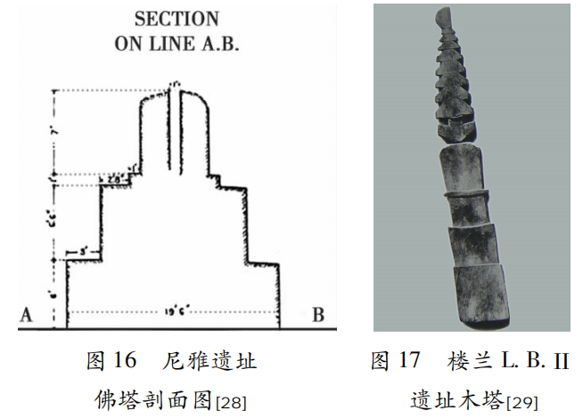 斯坦因1901年在古代楼兰地区(公元前77年楼兰改国名为鄯善)发现的古代精绝尼雅遗址,遗址中的佛塔塔基为方形,两层,塔基上方残存圆柱形塔身(图16)。这座佛塔的年代一般认为是3世纪,现仍矗立于尼雅遗址。[24]在安迪尔河下游的安迪尔遗址中,斯坦因也发现了一座佛塔,形制和尼雅佛塔相似,最下方有台座,其上是两层方形塔基,塔身圆柱形。斯文·赫定在楼兰L.B.II遗址发现一小木塔(图17)。[25]该塔的塔基较高,共两层;塔身圆柱形,上为底部内缩的半球形覆钵,覆钵上方有平头和伞盖。类似的木制佛塔斯坦因也有发现。[26]