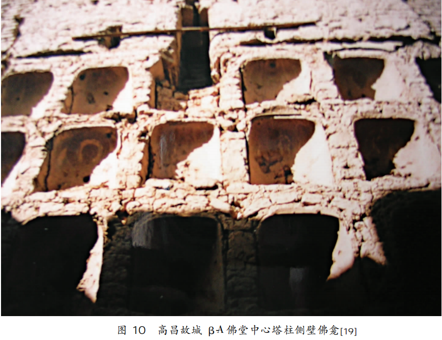 6. C-II型:方形塔柱正面塑一高大佛像,其余三面和C-I型一致,底层较高,各开多个大龛,上面各层开多个小龛。如高昌故城β-A佛堂的中心塔柱(图9,塔柱正面已残毁,现为近年修补)。该塔柱残高约14米,塔基边长10.60米。格伦威德尔报告中记载塔柱正面(东壁)残存佛像脚部,现已不存在。塔柱南壁有四层佛龛,最底下一层有三个大佛龛,高1.50米,宽1.38米;上面三层为小佛龛,每层有5个佛龛,每个佛龛高80厘米,宽55厘米。佛龛为圆拱马蹄形,内为坐佛像,彩绘圆形头光和身光尚存(图10)。塔柱西壁尚存部分佛龛,北壁已残。
