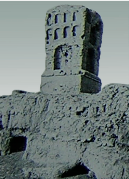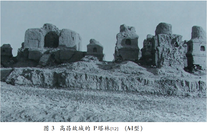 1. A-I型:塔基平面方形,共有两层,仅在上面一层四面开龛。如高昌故城的P塔林的小佛塔(图3)。现该建筑仅剩一残高约3米的塔状建筑。据格伦威德尔的记载,P建于一高台上,中间为一组五塔建筑,四边角各有二十座小佛塔,各自呈4×5的矩阵分布。这些小佛塔台座高1米,其上为塔基。塔基有两层,第一层高约3米,第二层四面开龛,龛为圆拱马蹄形,尖顶火焰状龛楣。塔基上残存部分圆柱形塔身,顶部已残。五塔建筑中位于中间的塔最高(残高5.50米),台座方形,边长3.70米,塔基四面开龛,内为立佛像,尚残存泥塑背光痕迹。