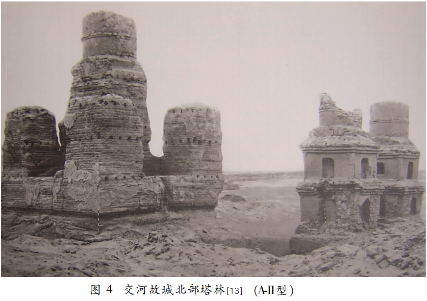 2. A-II型:和A-I型类似,塔基两层,每层四面各开一龛。如交河故城北部塔林的小佛塔。该塔林四周有围墙痕迹,中间是一组五塔建筑,四边角各有25座小佛塔,呈5×5矩阵分布。每座小佛塔塔基为方形,边长近4米。从20世纪初俄国人奥登堡所拍摄的照片(图4)观察,这些佛塔塔基两层,每层塔基四面皆开龛,为圆拱马蹄形,塔基上面是圆柱形塔身残余,中间饰一圈凸棱。现这些佛塔仅有4座尚残存一层塔基,其余佛塔皆仅残留台座部分。中央五塔建筑建于边长9.70米的台座上,中间的主塔残高6.90米,塔基方形,从塔基的木桩孔洞可推测原先塔基也是两层,塔基上面为圆柱形塔身残存部分,用土坯砖垒砌,中间装饰一圈凸棱。主塔四边角各有一方形塔,残高3米。