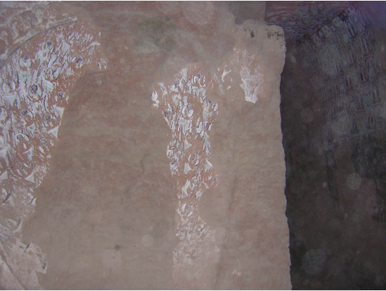 [32]2001年9月晁华山教授于此发现联珠纹样。2004年3月笔者赴新疆调查时,新疆自治区文物局梁涛先生也告知他曾在此佛堂中发现一排联珠纹,大部分残毁。