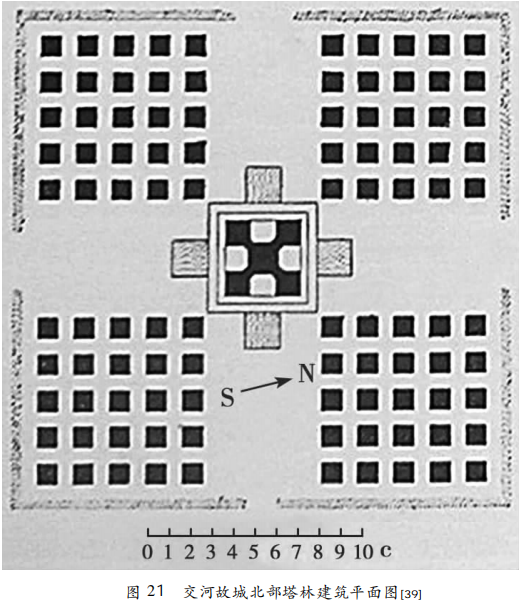 高昌故城P塔林建筑和交河故城北部塔林建筑都是由中央金刚宝座塔和四隅的众多小塔构成(图21),这种建筑方式不见于印度、中亚和中原内地,应是高昌独创。弗兰兹博士认为这种五塔式建筑是密教曼荼罗的象征。[37]但如果我们注意到龟兹石窟中有相当多的五佛堂佛寺,即五座中心柱石窟共同构成一座寺院,而以位于中间的中心柱窟规模最大,晁华山教授认为这是代表佛的“五分法身”。[38]高昌十六国时期的金刚宝座塔,其年代早于密教在中国的传播时间(7、8世纪),所以应该也是象征佛的“五分法身”,而和晚期密教以五塔象征五方佛的涵义有所不同。