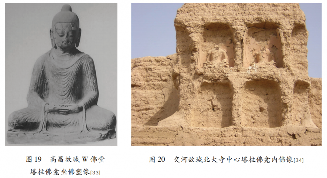 属于B型的高昌故城W佛堂的塔柱佛龛内尚存一完整坐佛塑像(图19),高约50厘米,结跏趺坐于一低矮台座上,双手结禅定印,身体较为清瘦,肉髻光滑(有蓝色彩绘痕迹),杏眼微闭,通肩袈裟轻薄贴体,下摆覆盖双足,衣纹线呈U字波浪状。这尊坐佛的形象属于印度笈多风格,和北凉石塔中坐佛的形象很接近,在图木舒克的托古孜沙莱寺院中也发现有形象类似的木雕坐佛,年代大致属于5世纪。属于C型的高昌故城β-A佛堂的主室末礼拜道外侧壁距地面1米高处残留有壁画痕迹,纹样为联珠纹。[32]联珠纹壁画在吐鲁番流行的时间是5、6世纪。同属C型的交河故城北大寺中心塔柱佛龛内尚余存部分佛像(图20),虽然头部已残,但衣纹也是轻薄贴体的笈多风格,年代也大致是5~6世纪。据此,我们可把B型和C型塔柱在高昌地区的流行年代定在5~6世纪。
