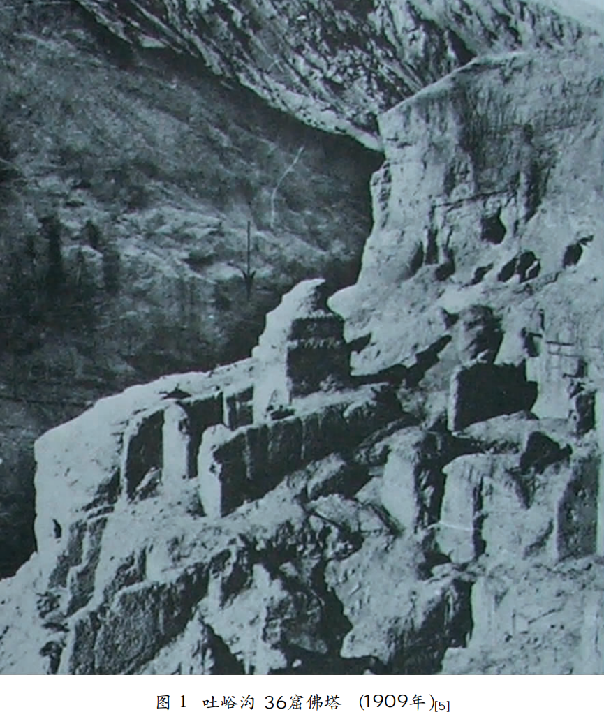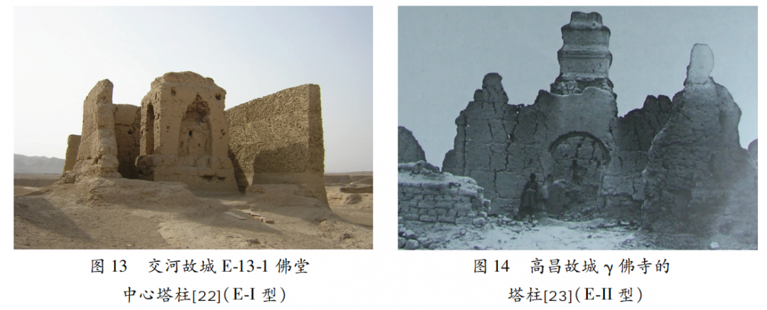 在古代高昌的遗址中,以众多的佛塔和塔柱最引人注目。塔,梵文为Stupa,音译为“窣堵坡”。佛涅槃后焚棺所得的舍利藏于塔中,因此塔也成为佛的象征,是信众的主要礼拜对象。印度石窟中的覆钵塔在龟兹石窟演变为中心塔柱形式,主要是保留佛塔的塔基部分。高昌地区佛寺中的塔柱更具早期佛塔特色,从19世纪末和20世纪初俄、德等国探险家所拍摄的照片看(如图1吐峪沟第36窟和高昌故城γ佛寺),相当部分塔柱把塔基延伸至佛寺建筑顶部外端上方,这一部分仍残留圆柱形塔身及覆钵,也就是说这些塔柱实际上仍是保留窣堵坡佛塔形制。露天佛塔和寺院中心塔柱虽然在功能和性质上有所差别,但就塔基塔身形制而言,在古代高昌地区这二者的形制基本相同,故本文把佛塔和塔柱并在一起研究。部分高台塔状佛堂,如交河故城E-28佛堂,过去许多著作称之为“中央大塔”,实则为高台佛殿建筑,本文暂不以论述。