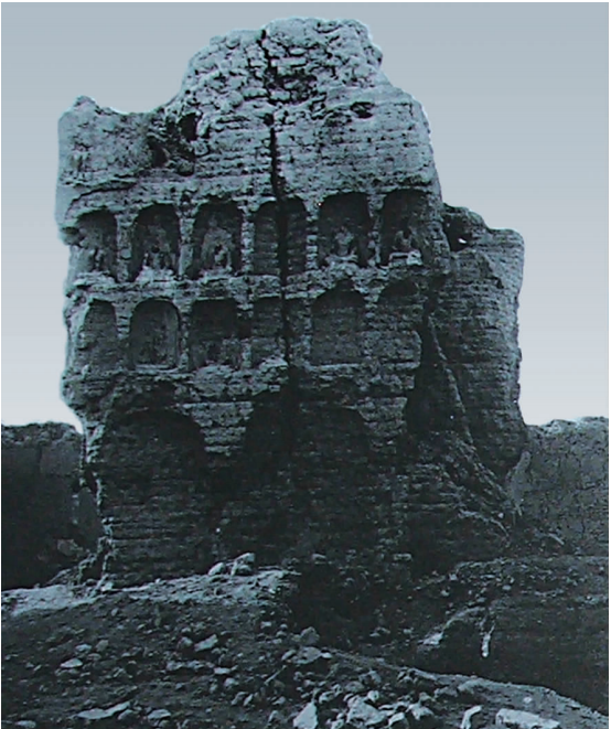 3. B-I型:塔基方形,多层,底层较高,四面各开一大龛,上面各层四面开多个小龛。高昌故城的π、τ、е、ρ四座佛寺塔柱属于此种样式。这些建筑现已荡然无存。我们只能从格伦威德尔所拍的照片观察到其样式(图5)。