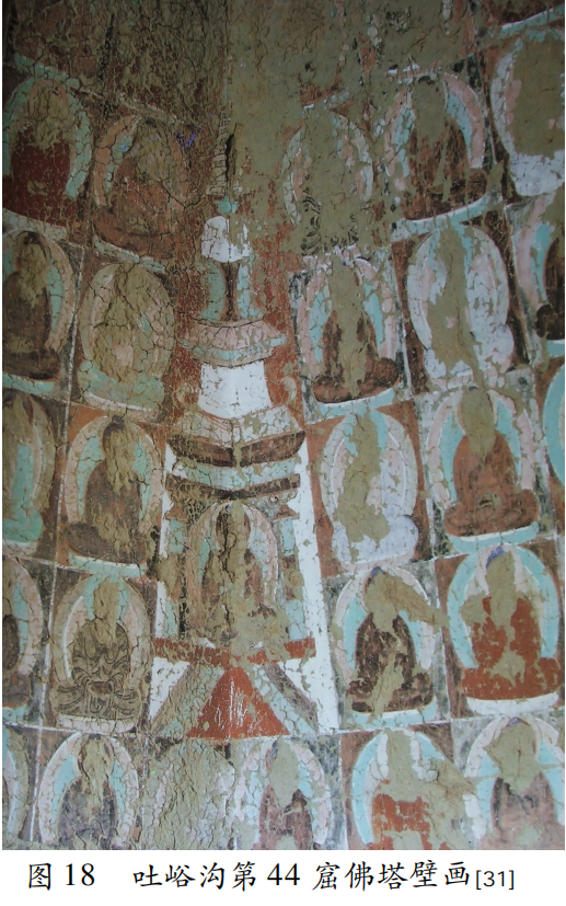 楼兰和尼雅佛塔的年代大致为3~4世纪,其形制也是渊源于贵霜时期犍陀罗地区的佛塔,但已出现了变化,主要表现在两个地方:一个是塔基的增高,另一个是塔基层数的增加。犍陀罗佛塔的塔基并不高,相对而言,其圆柱形塔身比较高。楼兰地区佛塔明显增加塔基高度,有的塔基呈正方体或竖长方体状,其纵向高度甚至超过底径。楼兰的佛塔还把塔基层数增加到两层,这样使塔基成为佛塔重要部分,在整体比例上,塔基所占比重超过圆柱形塔身和覆钵。另外,相对塔基增高圆柱形塔身和覆钵缩小,为区分塔身和覆钵,一般在这二者之间装饰凸出的棱线。很明显,这些特征和高昌A型佛塔是一样的。同时,我们注意到,龟兹中心塔柱塔基只有一层,而且只是正面开一龛;楼兰的佛塔则没发现在塔基上开龛。因此,从地理交通和文化交流的角度看,可以认为方形塔基两层,四面开龛是高昌地区A型佛塔混合这两个地区样式后的首创。吐峪沟第44窟主室四隅绘有此类型的佛塔(图18),其最底层的台座似是有登临的阶梯,塔基两层,其上为圆柱形塔身、覆钵、平头、伞盖,底层塔基转角突棱处绘一坐佛,用于表现塔基的开龛造像。吐峪沟第44窟的年代一般认为是北凉时期或更早,大致可确定在4~5世纪,这可作为A型佛塔年代的参考。[30]