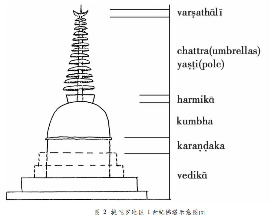 西域地区佛教文化和佛教艺术的主要渊源是贵霜王朝时期的犍陀罗地区,佛塔形制的渊源也是一样。贵霜时期犍陀罗地区的佛塔大致出现于公元前后,和印度早期的佛塔形制已有区别,最主要变化是把塔基和塔身增高,在塔基和圆柱形塔身上浮雕佛传、本生故事和小坐佛。[8]早期佛塔的形制在小乘佛教的律典《根本说一切有部毗奈耶杂事》卷十八有记载:“应可用砖两重作基,次安塔身,上安覆钵,随意高下。上置平头,……中竖轮竿,次著相轮……”说一切有部流行于西北印度和中亚地区,是部派佛教时期的重要流派,这个记载是对当时窣堵坡塔的真实描述。以犍陀罗地区1世纪佛塔为例(图2),我们知道佛塔的组成从下往上依次为方形塔基(vedika),圆柱形塔身(Karandaka,外文著作或称为鼓身the cylinder drum),半球形覆钵(Kumbha),方龛形平头(Harmika),相轮伞盖(Chattra),部分佛塔在塔基下面还建低矮的台座。塔身一般是圆鼓形或圆柱形,和半球形覆钵连在一起,有时为区分这两部分,会在连接处装饰一圈凸起的饰带以示区分。国内的一些论述中,因有些佛塔的塔基很高且有多层,误把塔基称为塔身,而把最下方低矮的台座认为是塔基。从印度至中亚的窣堵坡发展演变看,这是错误的认识。本文中的塔身仅指佛塔覆钵之下圆柱形这一部分,其下面方形的基座称为塔基,塔基下方为台座。