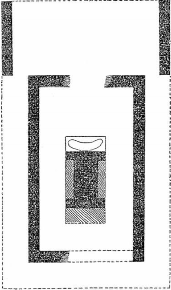 10.E-II型:塔基方形,一层,四面不开龛,只在四壁各塑一佛像。如高昌故城T'东侧佛堂和γ佛寺的塔柱。这些佛寺现已毁灭不存,仅可从格伦威德尔和勒柯克的报告中知其状况。其中γ佛堂(图14)的中心塔柱边长4.56米,台座每边皆有60厘米长的台子,结合塔基处尚可见到的方形槽洞痕迹,可判断塔基四面原先皆有立像。中心塔柱塔基向上延伸至屋顶外,其上尚有圆柱形塔身残余。
